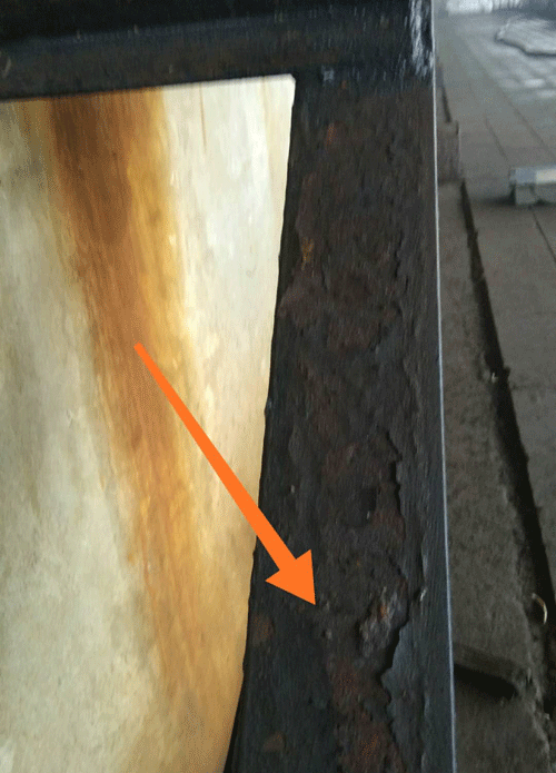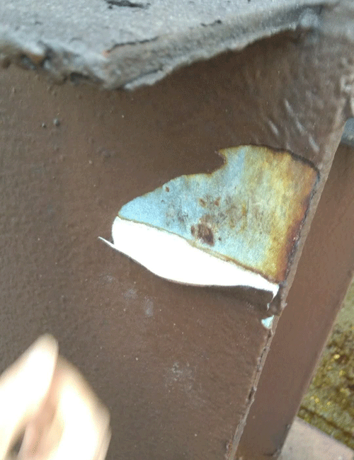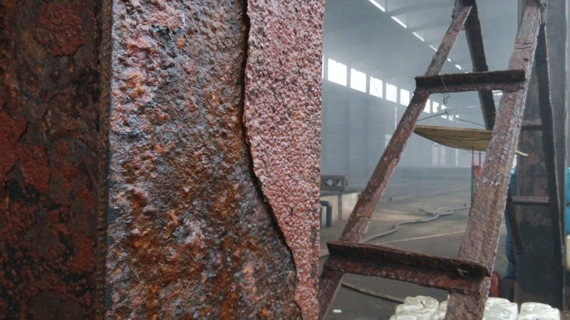 这是2018年1月回访该工程时拍摄的承重H型钢的状态,涂膜完好,强度弹性没有任何衰减。棕色外观是因为两年时间的酸气中铁离子的附着沉积。