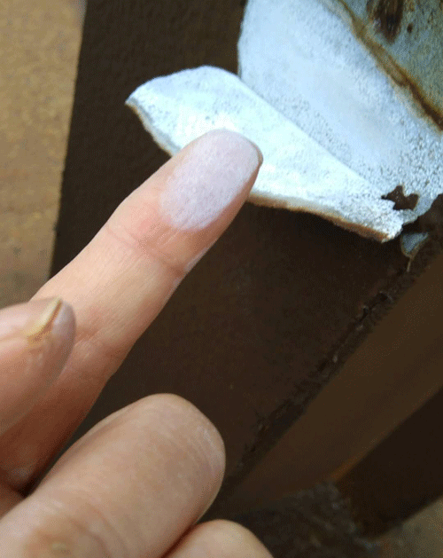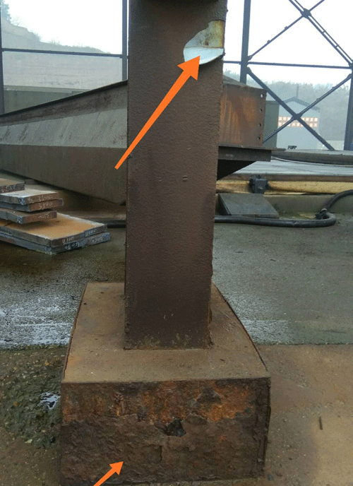 上面箭头所指是我们用刀切开涂膜的状态,里面钢结构完好无损没有丝毫腐蚀。下面箭头所指是基座没有用BY-01做防腐处理的情况,钢板已严重腐蚀,斑驳陆离。